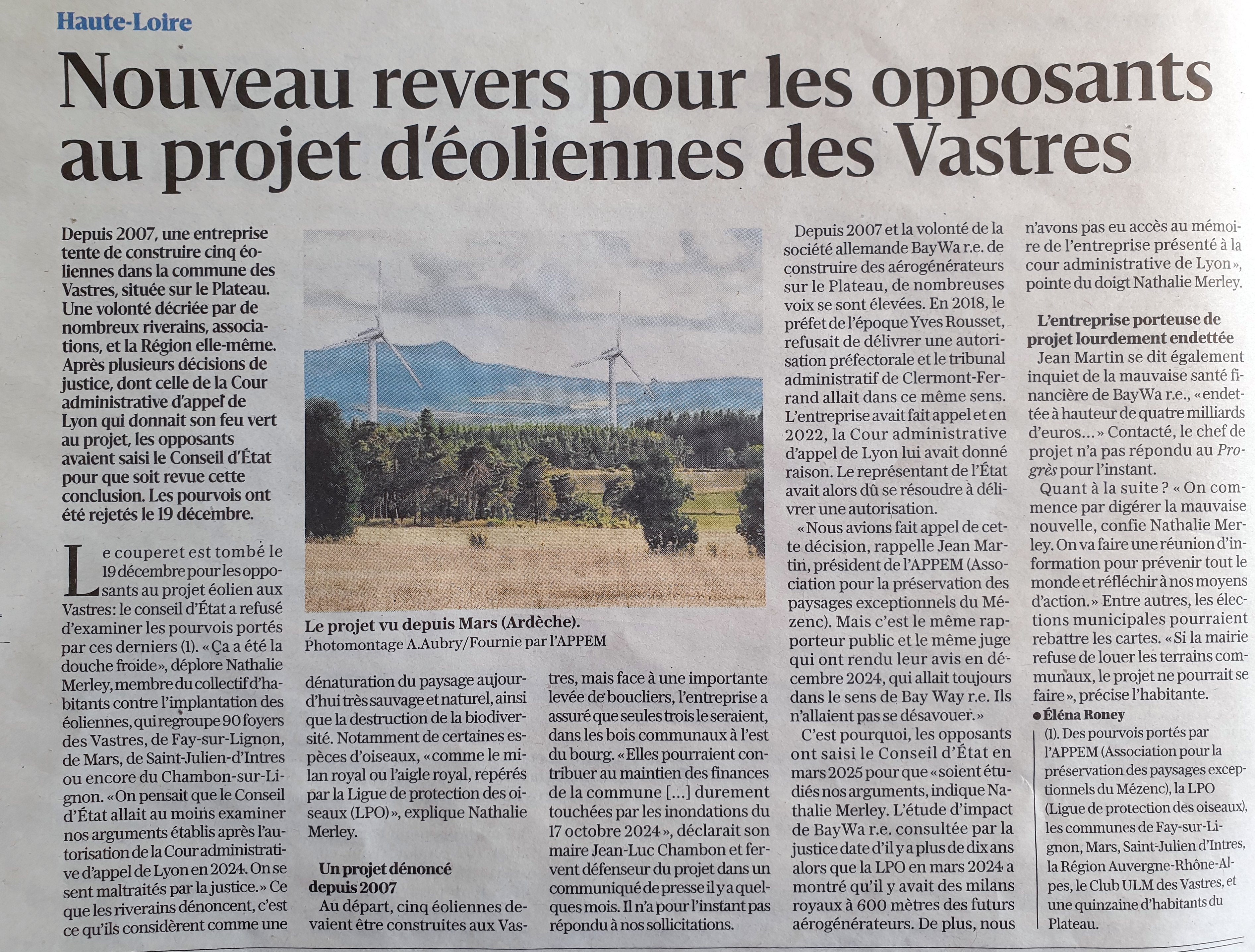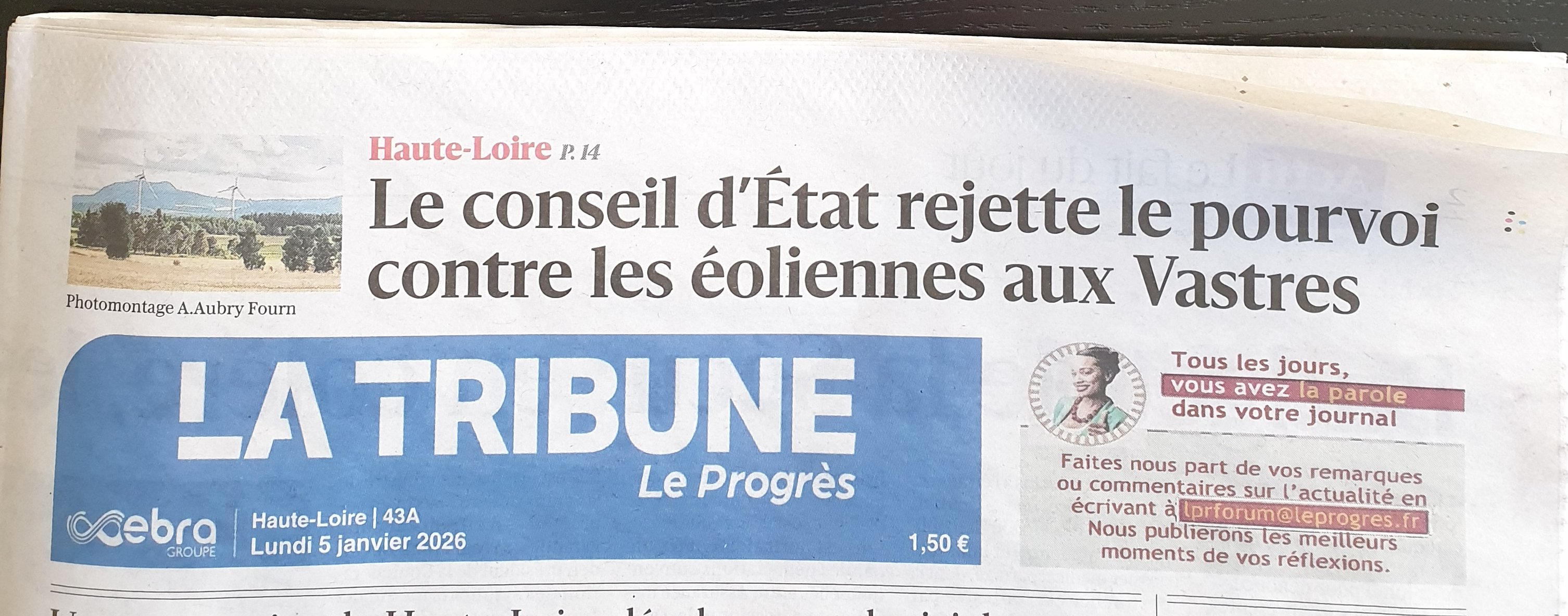 La FED a pris connaissance de la décision regrettable du Conseil d’État, en date du 19 décembre 2025, refusant d’admettre les pourvois formés contre le projet d’implantation d’éoliennes sur la commune des Vastres (Haute-Loire). Cette décision met fin aux voies de recours juridictionnelles engagées par plusieurs associations, collectivités et habitants.